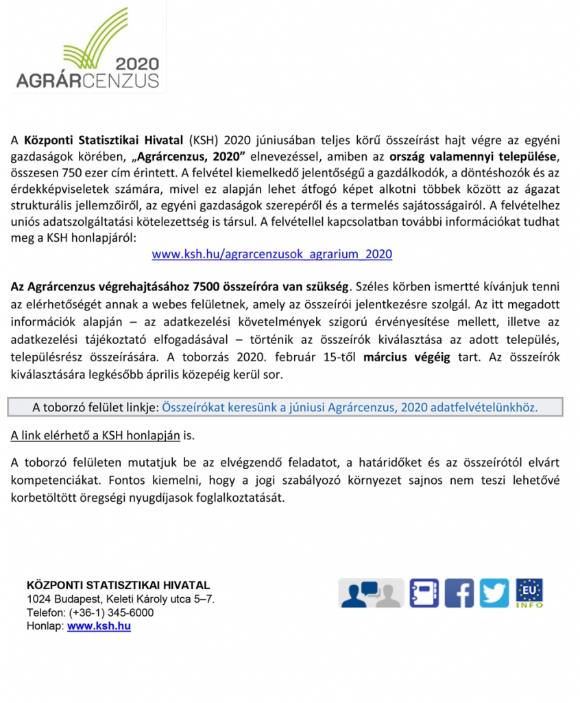 A toborzó felület linkje: http://www.ksh.hu/kerdoivek/ac2020/urlap.htmlAgrárcenzus toborzás