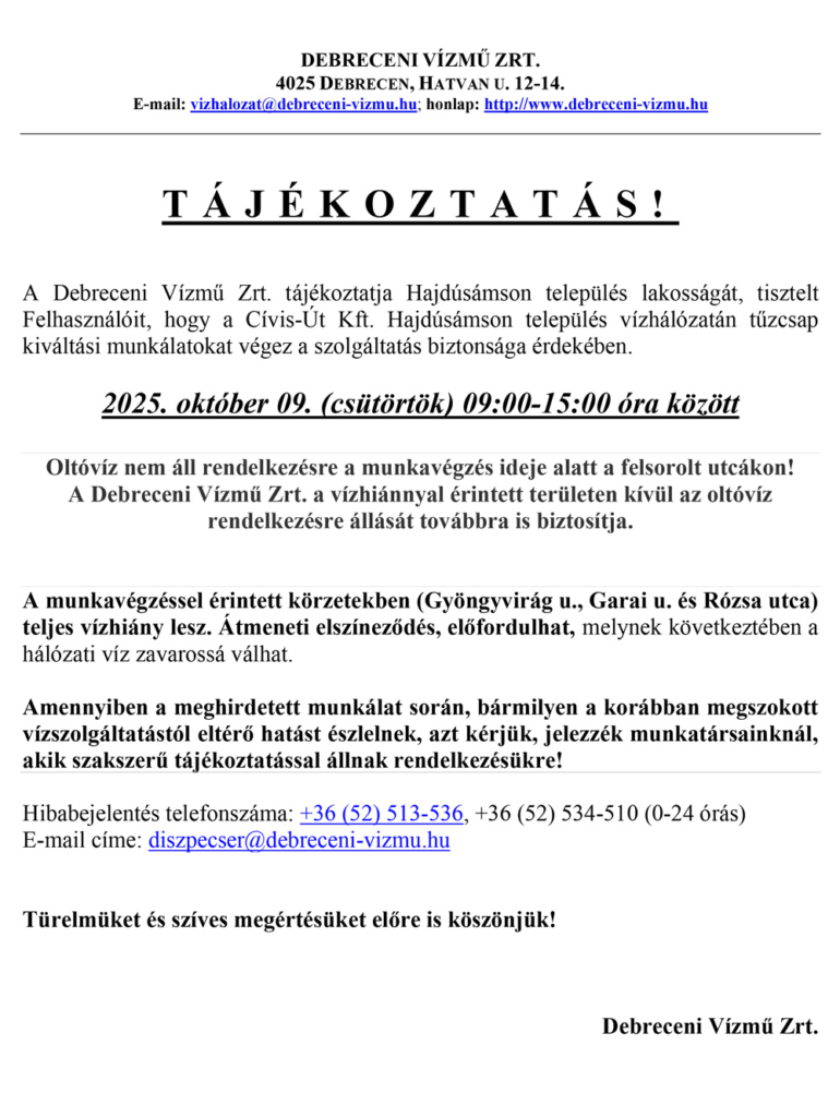 Tájékozatatás – Debreceni Vízmű munkálatai – 2025. október 09. (csütörtök)